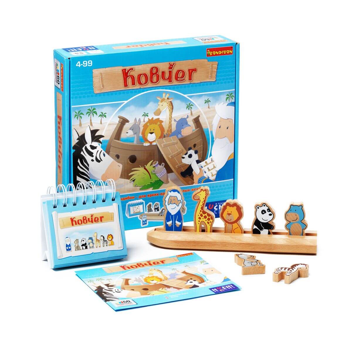 - 7 деревянных фигурок (Ной, зебра, жираф, кенгуру, панда, лев, бегемот),