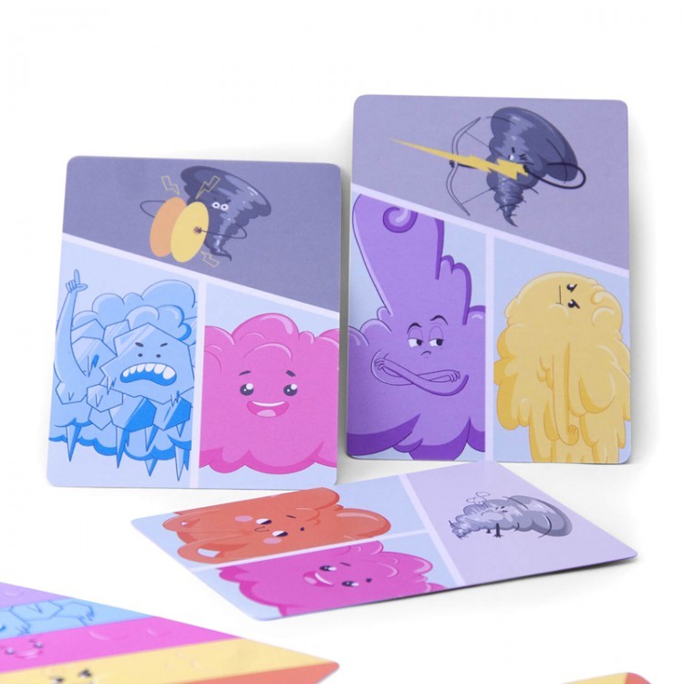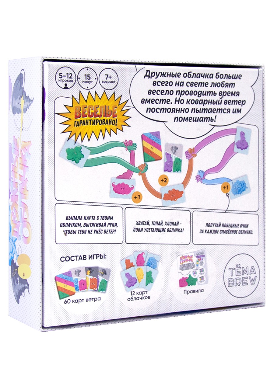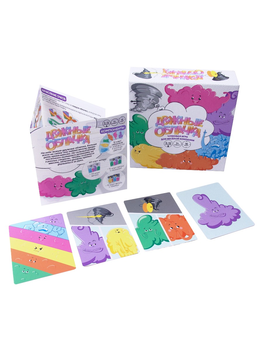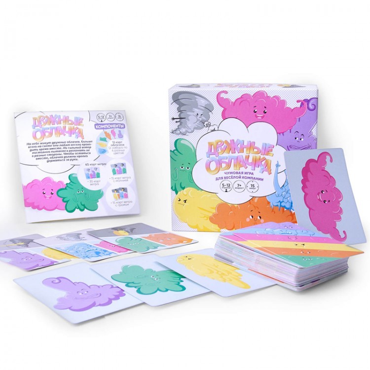 "Дружные облачка" — веселая игра для больших компаний, от 5 человек! Перед каждым игроком лежит карта облачка одного из шести цветов. В процессе игры ведущий открывает карту ветра, на которой изображены 2 облачка, которые ветер попытается сдуть в этом раунде. Задача игроков — быстрее всех определить, кому из игроков принадлежат данные облака и схватить их за руки раньше других. Но будьте внимательны, ведь в следующий ход все участники станут играть за новые цвета облачков!