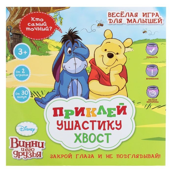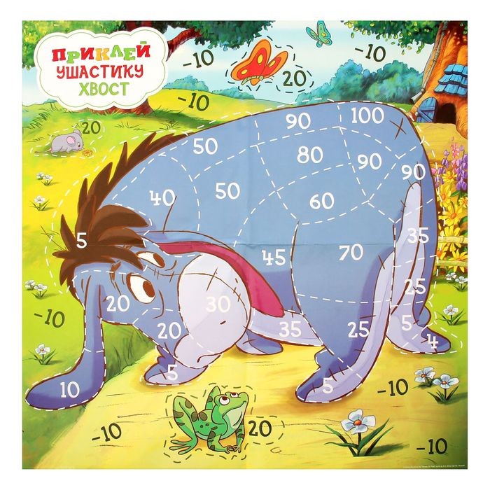 Весёлая игра для малышей! Разверните большое игровое поле, прикрепите его к стене, а хвостики из набора положите рядом. Закрывайте глаза, берите хвост и с помощью липкой ленты старайтесь приклеить его в нужное место. Чем точнее попадание, тем больше победных очков у игрока.