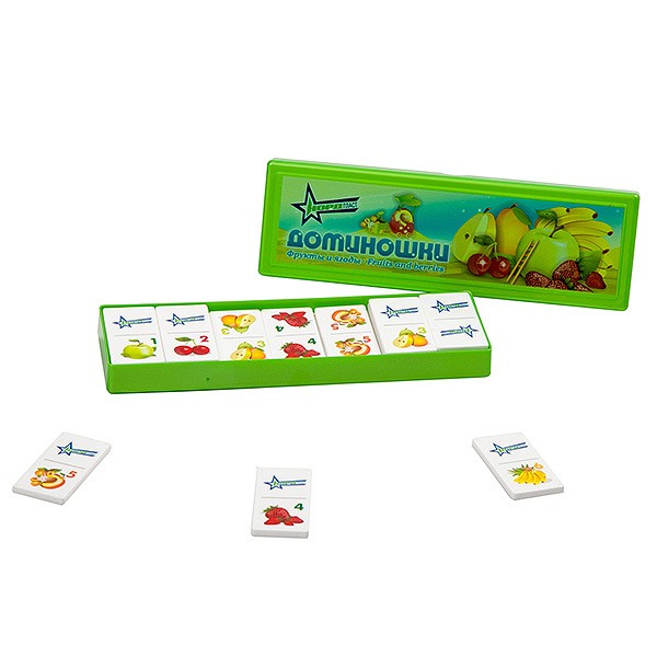 Доминошки «Фрукты и ягоды» в занимательной форме познакомят ребенка с цифрами и обучат счету. На наглядном примере дети легко усвоят новые знания благодаря изображению того, что им знакомо — разных ягодок и фруктов. Домино — интеллектуальная игра, способствующая развитию аналитических и логических способностей. Костяшки изготовлены из прочного и стойкого к износу пластика, и цветные изображения на них долго не сотрутся благодаря особой технологии их нанесения.