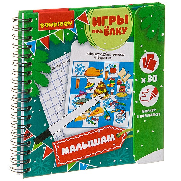 Развивающие игры МАЛЫШАМ - это набор карточек с различными заданиями на логику, смекалку, пространственное мышление, художественные навыки и концентрацию внимания! В наборе 30 карточек с задачками и ответами, маркер. Маркером можно рисовать на карточках, а потом с легкостью стирать! Вместе с замечательными мини-играми под ёлку от BONDIBON вы прекрасно проведете свой досуг в новогодние праздники! Красочные и интересные, они помогут провести время празднично и с пользой.