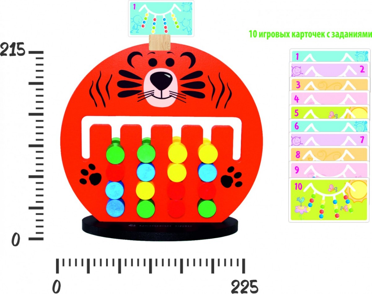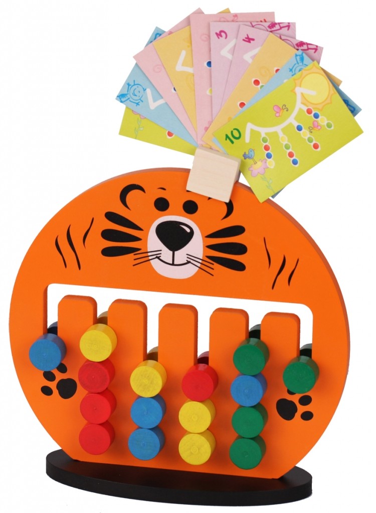 Внутри игрушки пролегают шесть прорезей — четыре подлиннее и две покороче. В них встроены цветные фишки, которые можно двигать, выстаивая из них определенные цветовые комбинации. Какие именно — подскажут карточки с заданиями, которые входят в комплект игры. В заданиях разработчики учли особенности детей от 2 до 7 лет, а потому задания тщательно выверены — они не слишком сложные, но и не такие простые, а чтобы справиться с ними ребенку предстоит приложить определенные интеллектуальные усилия. Чтобы не забыть задание во время игры, можно будет закрепить карточку на голове тигренка — там для этого предусмотрено специальное место.
