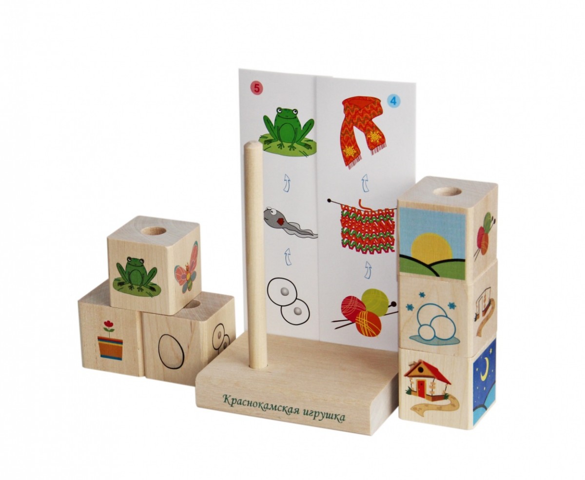 Основной элемент игры — кубики. На каждом из них есть изображения тех или иных событий. Разработчики задумали цепочки событий (например, утро — день — вечер или курица — яйцо — цыпленок). Задача ребенка — найти на кубиках изображения, вписывающиеся в одну цепочку событий и выстроить их в нужной последовательности. Родители могут предложить ребенку ту или иную карточку, в которой содержится задание, а малыш должен будет выбрать нужные картинки и правильно составить их. Почти для каждой карточки написано веселое и легко запоминающееся стихотворение. Скорее всего, ребенку захочется выучить те, которые понравятся ему больше всего, а значит — это еще и дополнительная тренировка памяти. Игрушка позволяет развивать пространственное и логическое мышление, выстраивать цепочки событий, расширяет кругозор.