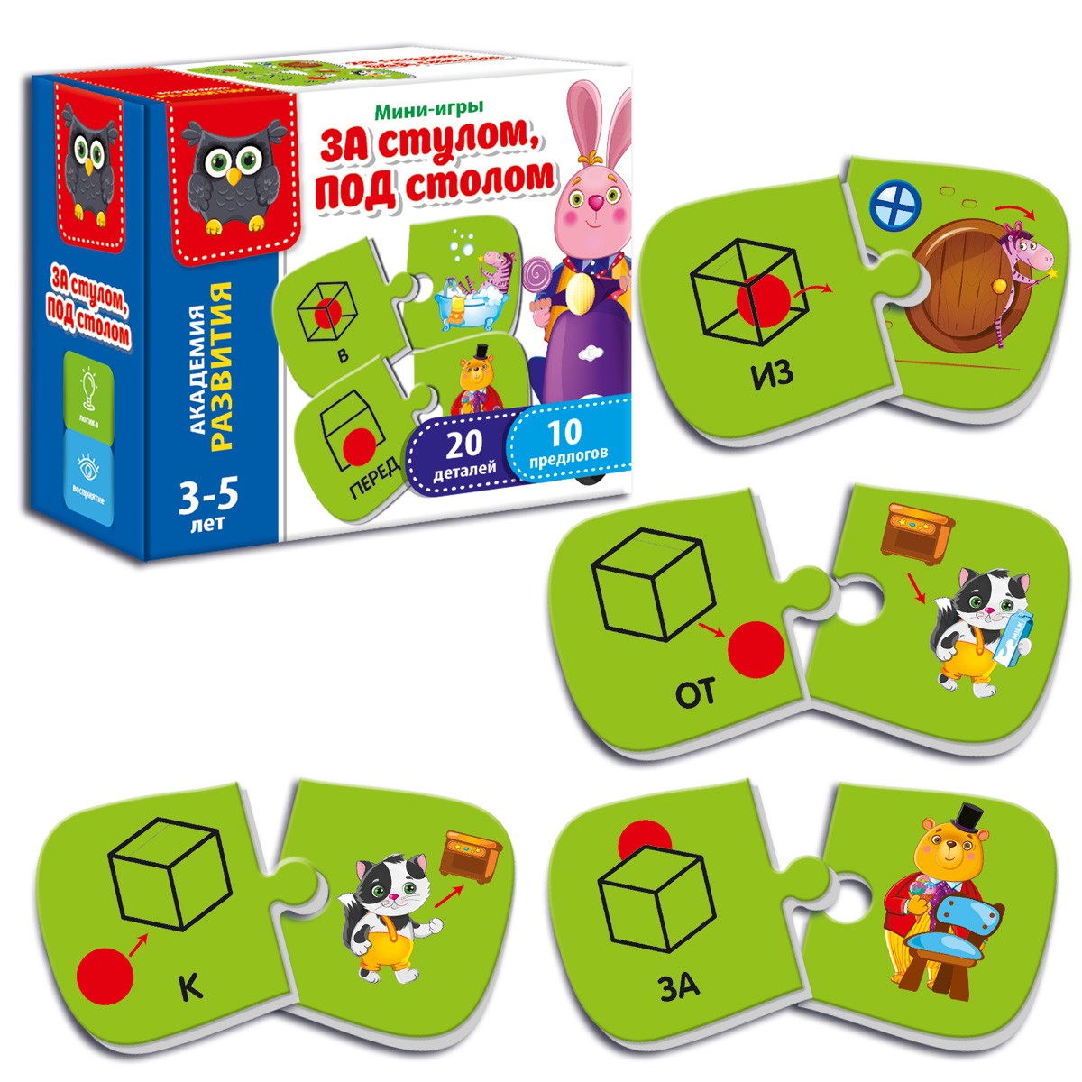 Пазлы-парочки. Соедини предлог (на, в, под…) с изображением, которое его иллюстрирует. Особенности: мягкие детали (4 мм).