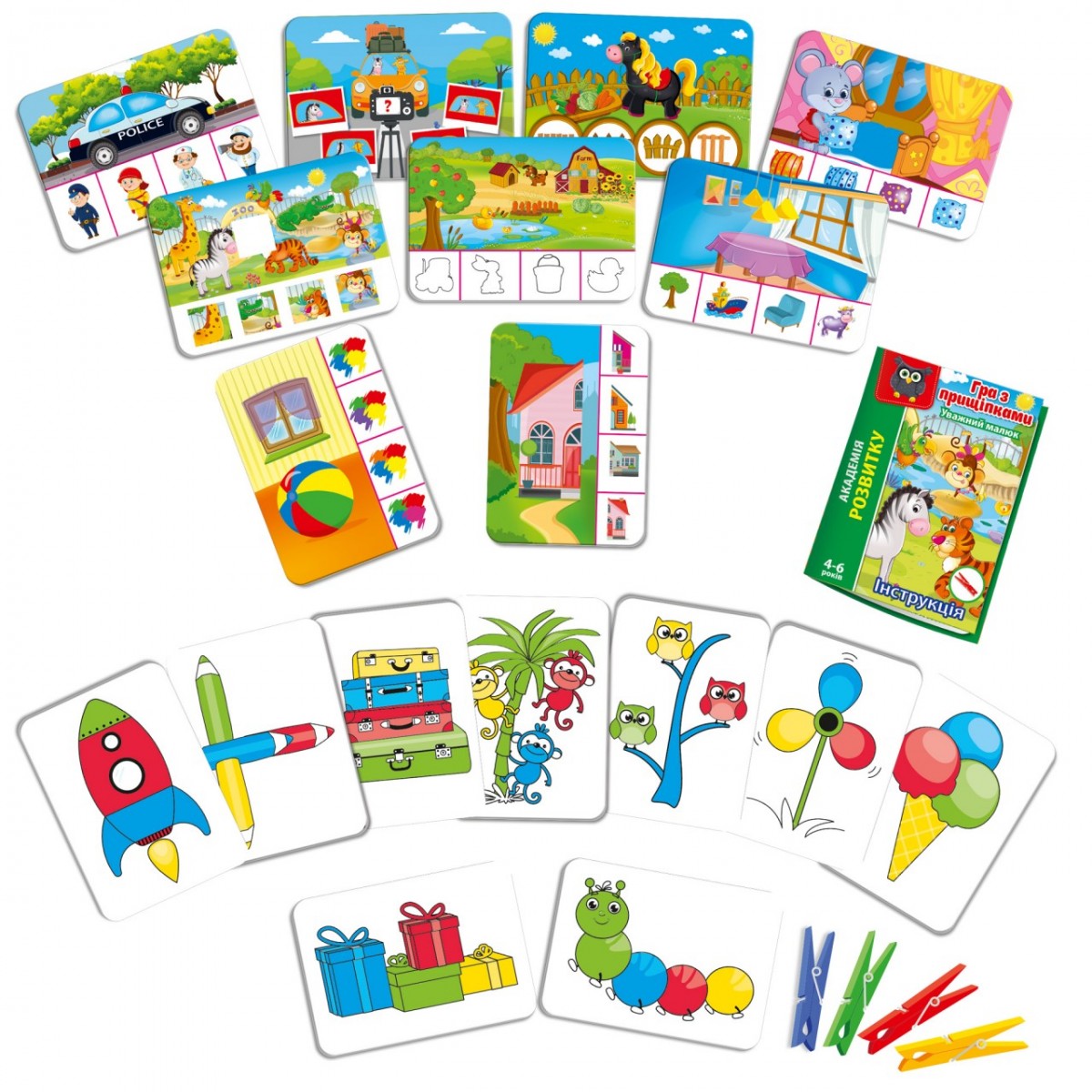 На карточках изображены задания. Ребёнок должен выполнить их и обозначить правильный ответ прищепкой или прищепками. Особенности: использование прищепок.